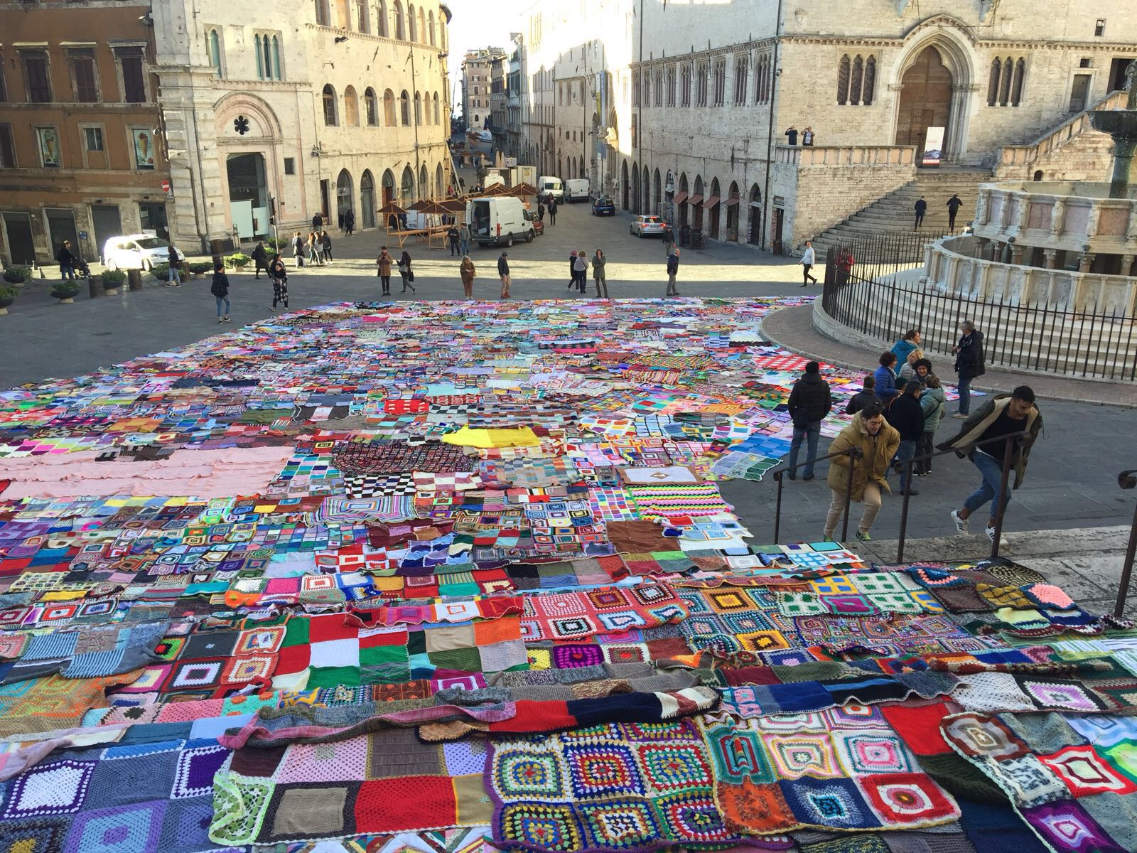 PERUGIA – Le scale del duomo di San Lorenzo e piazza IV Novembre. Fino ai piedi della Fontana maggiore. Tutto ricoperto di colori, lana e amore. Il cuore della città batte di solidarietà grazie alle mille coperte realizzate da tanti volontari e pronte per essere regalate ai terremotati di Cascia, a un anno dal terremoto.