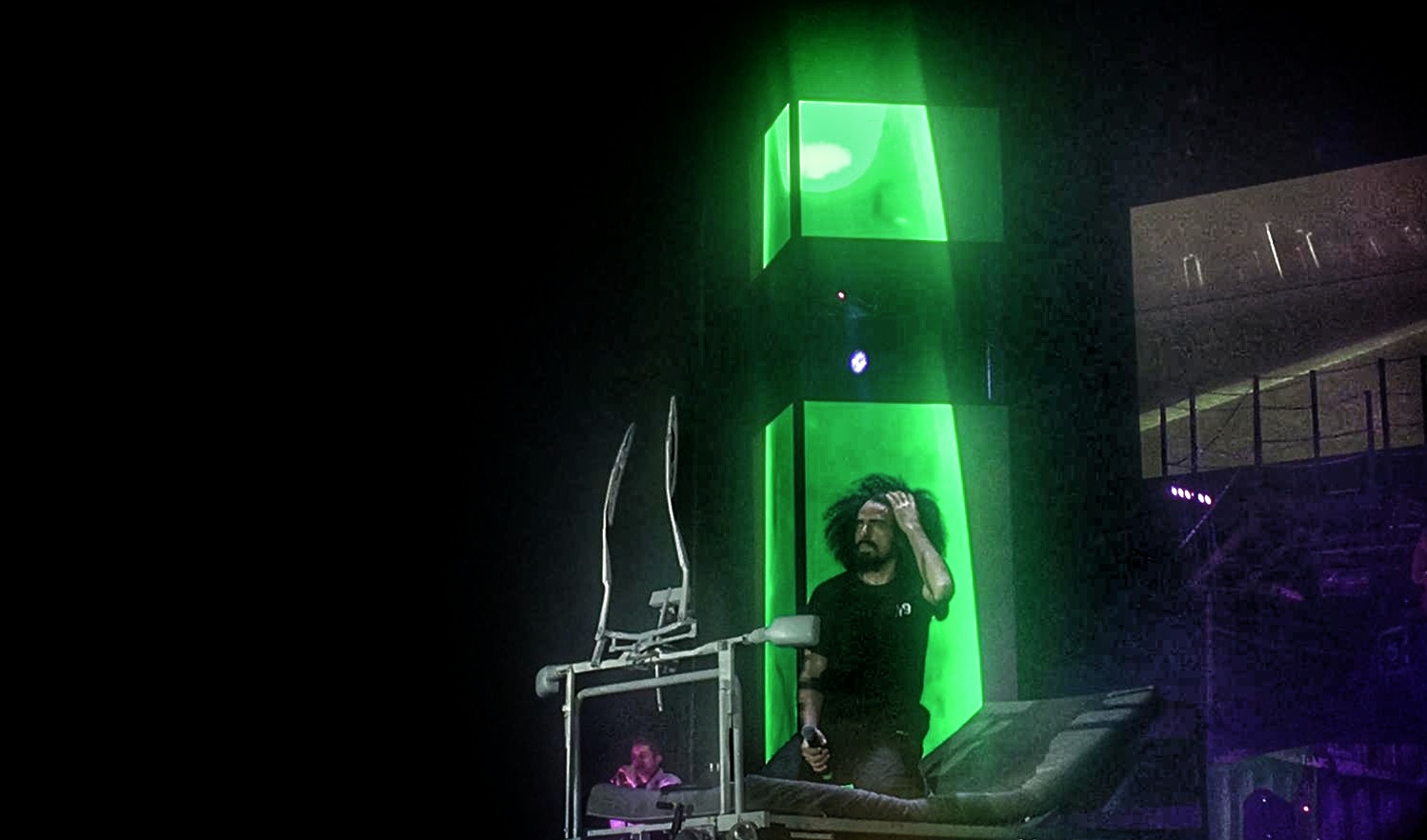 Molto bello il discorso fatto per introdurre “Mica Van Gogh”, dove ha voluto spiegare l’importanza del suo rapporto con questo artista e dove ha voluto ridare valore ad un uomo che a lungo è stato considerato fuori di senno, per i suoi ragionamenti e le sue azioni, fatte in un periodo dove nessuno era in grado di comprenderle. Durante l’esibizione di questo brano, si comprende che anche le creature losche presenti all’inizio del concerto sul palco, sono in realtà quei corvi che, come perseguitavano Van Gogh, lo fanno con ognuno di noi. Anche se Caparezza ha fatto abiura di sè(il brano “Abiura di me”, ndr) nessuno dimenticherà, una volta “Fuori dal tunnel del divertimento” di quella serata lo show dell’uomo venuto dalla Luna (“Vengo dalla Luna”,ndr).