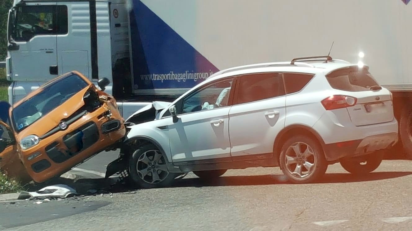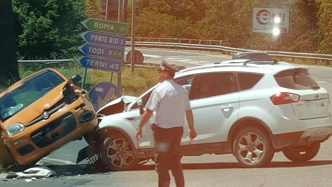 TODI (Perugia) – Brutto incidente intorno all’ora di pranzo appena fuori dalla E45, allo svincolo di Todi. Dove due auto, una Ford Kuga bianca e una Fiat Panda di colore arancione, si sono scontrate rimediando entrambe diverse ammaccature. L’impatto è stato violento, evidentemente. Quasi frontale. Tanto da alzare dal suolo la piccola utilitaria, rimasta incastrata sotto il peso del suv fino all’arrivo dei soccorsi. Sul posto la polizia municipale locale, per i rilievi del caso e per evitare rallentamenti al traffico, comunque contenuti.
