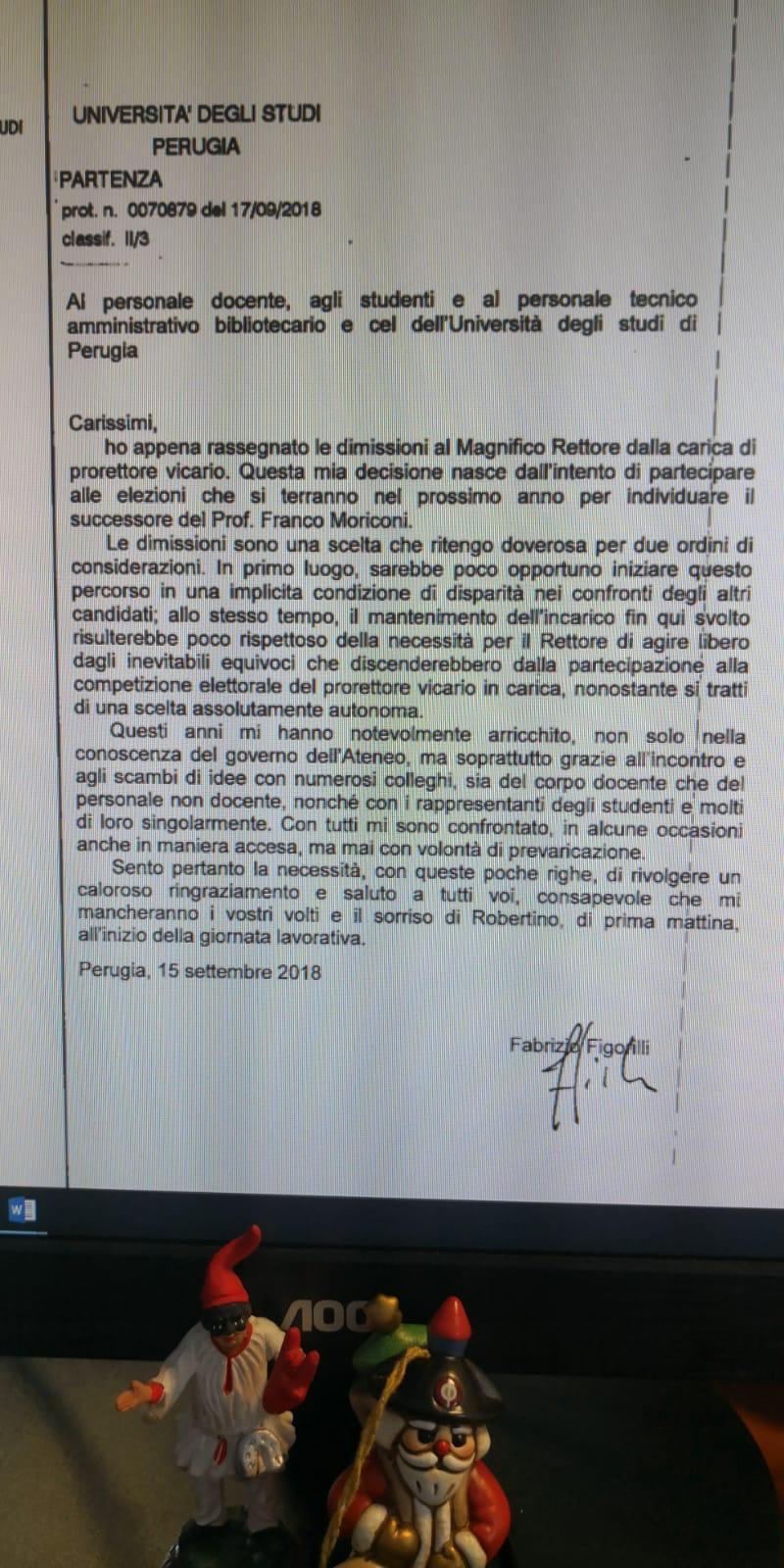 L’interpretazione della lettera è quanto di più complicato ci possa essere, roba da indovina di Delfi, ma invece viene considerata semplice la lettura del gesto. Figorilli vuole candidarsi alle prossime elezioni da rettore, ripetono i tam tam accreditato dentro e intorno all’Università, e vuole avere le mani libere, in questo momento in cui l’azione di Moriconi è assai criticata, con consensi decrescenti anche tra quelli considerati del cerchio magico del rettore vigente.