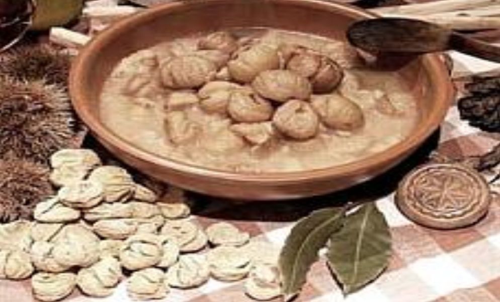 - In una pentola piuttosto grande preparare il brodo. Far soffriggere l’olio, l’aglio, il rosmarino, il concentrato di pomodoro e aggiungere il sale e la quantità d’acqua necessaria per cuocere la pasta. Quindi togliere l’aglio e il rosmarino, unire le castagne in parte spezzettate e versare la pasta