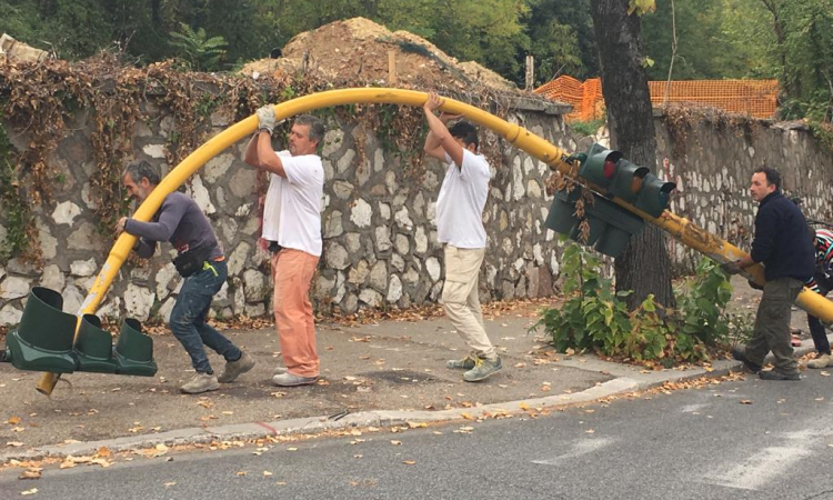 Con l’intervento di un camion con braccio e operazioni successive, sono stati asportati tutti i pali, superando non poche difficoltà dovute alla compresenza del traffico abbastanza intenso nelle prime ore della mattinata. Sono state realizzate isole pedonali e la rotonda provvisoria in jersey di plastica, di diametro ridotto rispetto a quella definitiva, che sarà posta in essere entro il mese di novembre.
