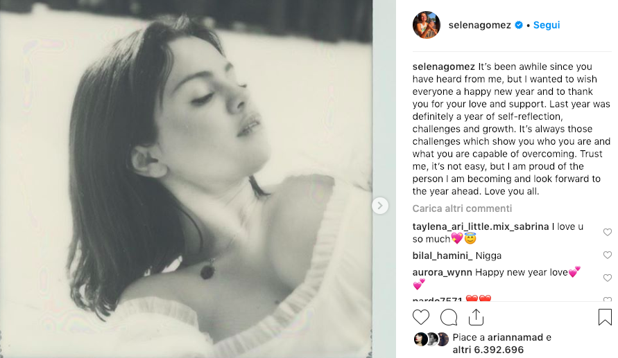 Eppure, Selena Gomez, oggi 26enne, dopo un anno difficile, un trapianto di rene, due ricoveri e un crollo emotivo che l’ha convinta a tornare in riabilitazione in un centro di salute mentale, a settembre aveva salutato i suoi fan prendendo una pausa dai social. Dove è riapparsa ieri, postando su Instagram tre foto in bianco e nero e gli auguri per un buon 2019 ai suoi tantissimi follower, che in meno di 12 ore l’hanno ringraziata con sette milioni di like. «È passato un po’ di tempo da quando non mi sentite, ma voglio augurare a tutti un felice anno nuovo e ringraziarvi. Lo scorso anno è stato per me sicuramente un anno di auto-riflessione, sfide e crescita. Sono sempre le sfide che ti mostrano chi sei e cosa sei capace di superare. Credetemi, non è facile, ma sono orgogliosa della persona che sto diventando. Vi amo tutti».