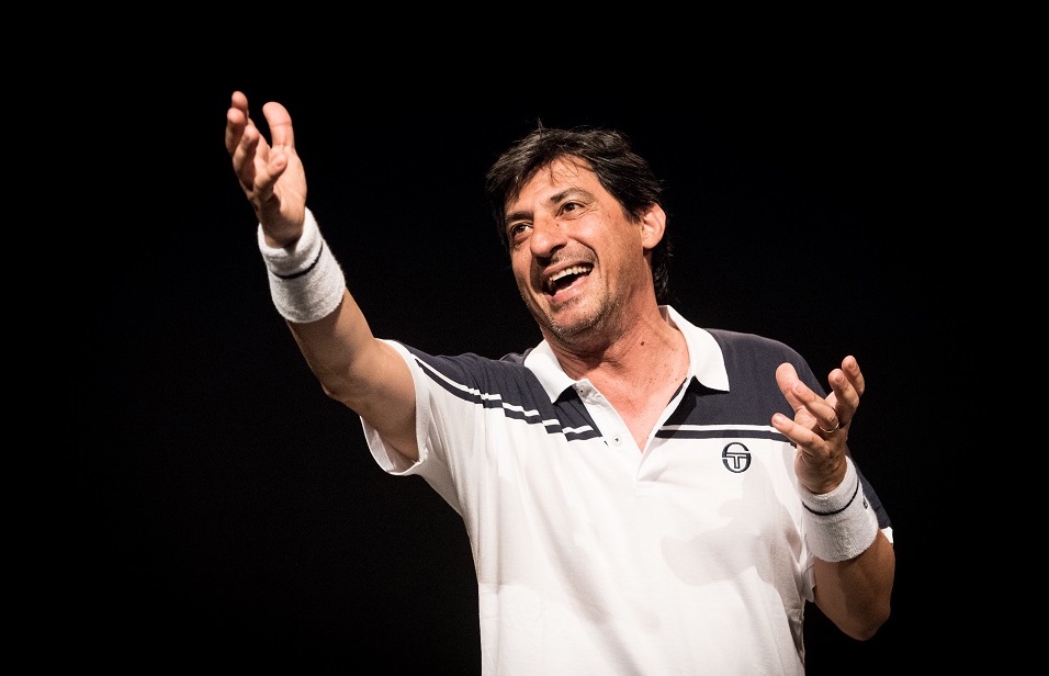 «Chi si trovasse a dare un’occhiata al testo letterario e poi al monologo teatrale che ne ho tratto, – racconta Umberto Marino – troverebbe una grande differenza con lo spettacolo che vedrà. Man mano che insieme a Emilio Solfrizzi mettevamo in scena il testo ci siamo resi conto che potevamo elevare la posta della nostra scommessa puntando a una rappresentazione completamente affidata alla centralità della parola e dell’attore. Mi sono ricordato del “cuntastorie”, una arcaica forma di attore totale siciliano di cui racconta Pitré, un attore di strada provvisto di tre panche per il pubblico e di due spade, unici supporti per raccontare e rappresentare al suo pubblico l’intero ciclo della tavola rotonda. Così, forte dell’interprete che avevo, ho cominciato a togliere e a semplificare, fino a che in scena sono rimaste solo le poche righe bianche che disegnano un campo da tennis e due sedie, quelle sulle quali, nei cambi campo, i tennisti si riposano. Appena siamo stati in grado, da molto presto, abbiamo cominciato a ospitare degli spettatori. Prima due, poi quattro, dodici, trenta, per mettere a punto e verificare gli effetti comici e quelli drammatici. Gli spettatori ci hanno detto che avevano visto il campo, l’arbitro, la palla, la racchetta, i colpi e, fidandoci di loro, affrontiamo una verifica più vasta e impegnativa, sperando che la metafora, prima nascosta e poi svelata, che il testo contiene trovi in questo modo la strada per arrivare al cervello e al cuore del pubblico che vorrà condividere con noi questa esperienza».