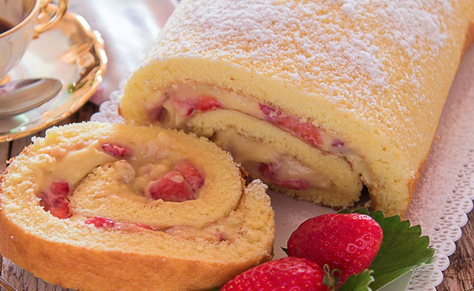 - Quando il pan di spagna si sarà raffreddato, togliere il canovaccio o la leccarda da sopra, tagliare i bordi laterali a destra e sinistra di due centimetri e stendere su tutta la superficie la crema fredda, poi farcire con le fragole tagliate a fettine sottili