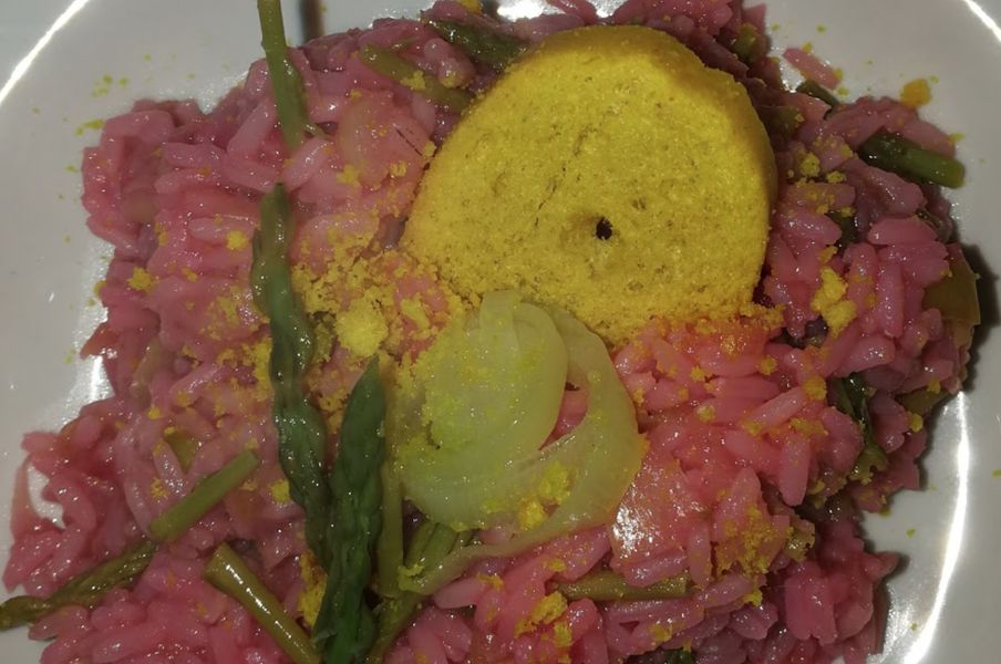 320 gr. di riso | brodo vegetale di barbabietola sedano carota e cipolla | ½ cipolla | 1 cucchiaio di olio e.v.o. | 2 dita di vino bianco | 200 gr. di barbabietola | sale q.b. | pepe q.b. Per mantecare e guarnire: una noce di burro | 50 gr. di asparagi | 1 manciata di parmigiano reggiano grattugiato | ½ porro medio | curcuma q. b.