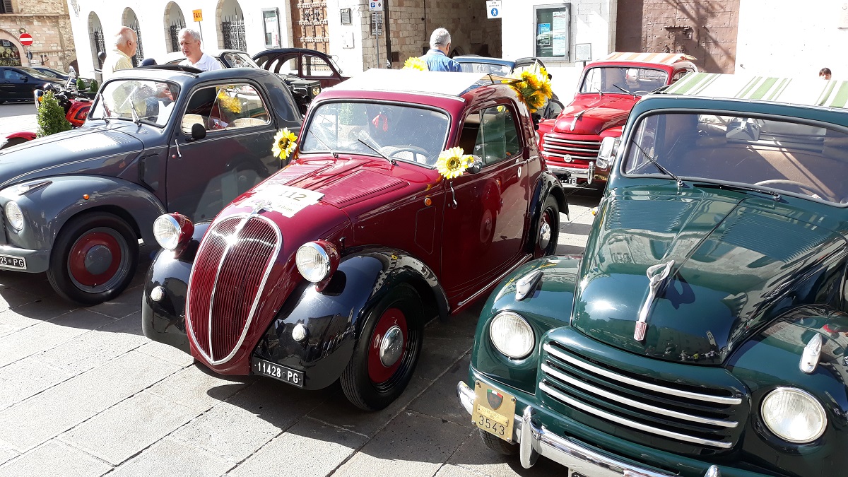 Simpatica, piccola ma confortevole, la piccola utilitaria ha segnato un’epoca. Il Topolino è stato presentato il 15 giugno del 1936 con il nome di FIAT 500 e venduta al prezzo di 8.900 lire. Non venne mai chiamata FIAT 500 ma “Topolino” per le sue ridotte dimensioni. E da sempre ha generato simpatia e curiosità, tanto che tantissimi turisti e curiosi, armati di cellulare e macchina fotografica, domenica hanno immortalato conducenti e vetture in esposizione statica nella piazza del Comune ad Assisi. Molto bella la passeggiata verso la Cantina di Colsanto di Bevagna dove gli equipaggi hanno effettuato la visita guidata alla cantina.