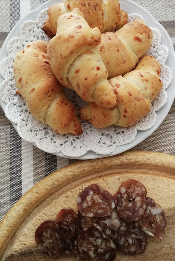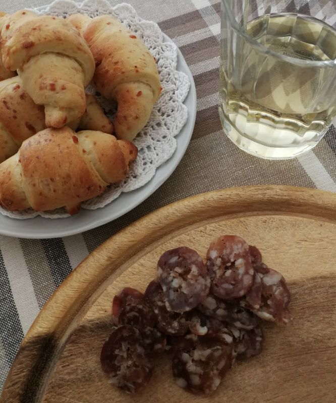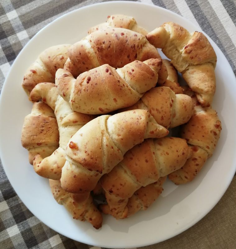 - Sulla spianatoia stendere con il mattarello un quarto dell’impasto lievitato, dando una forma circolare spessa mezzo centimetro, con la ruota tagliapizza realizzare 8 spicchi, prenderne uno alla volta ed arrotolare cominciando dalla parte più larga, facendo rimanere la punta sotto e dando la forma circolare tipica del cornetto