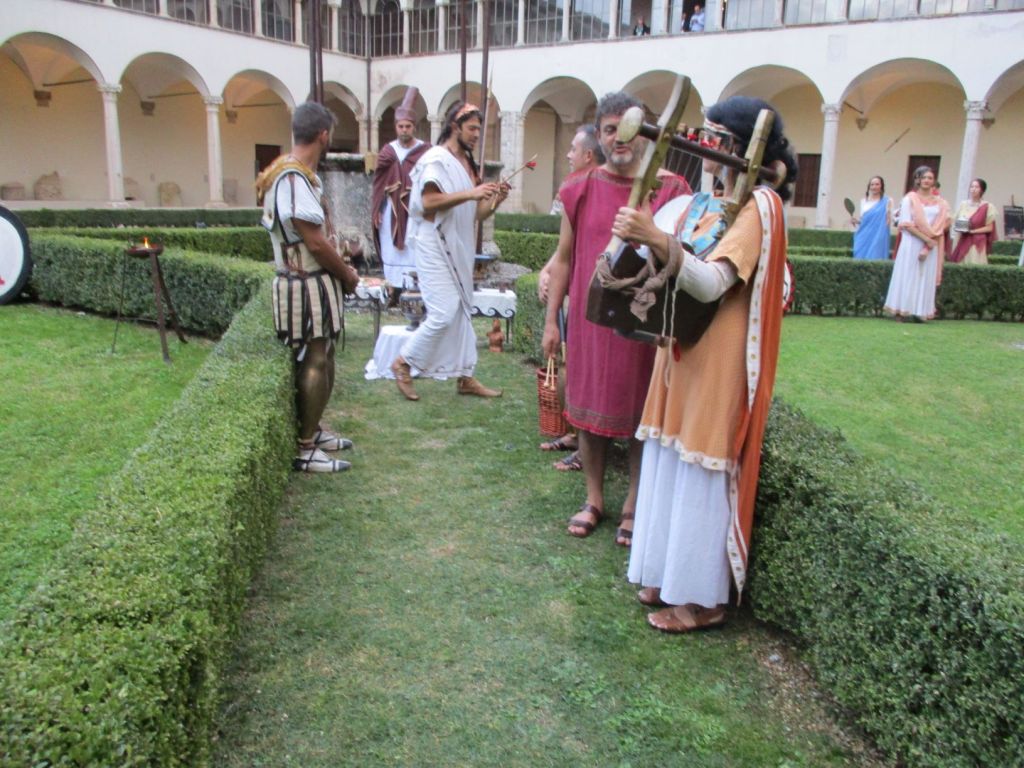 PERUGIA – È stato il Gruppo storico de “I Rasenna” di Cerveteri a rappresentare, nella seconda giornata di Velimna 2019, il “Matrimonio Etrusco”. Nel suggestivo chiostro di San Domenico annesso al Museo Etrusco i 40 figuranti, tutti in costume etrusco, hanno dato vita alla interessante cerimonia di un matrimonio celebrato da Zilath, il grande magistrato, con l’ingresso nell’area sacra del corteo di guardie, aruspici, musici, della sacerdotessa di Uni (divinità etrusca della fertilità), degli sposi, ovviamente, genitori, parenti, amici.