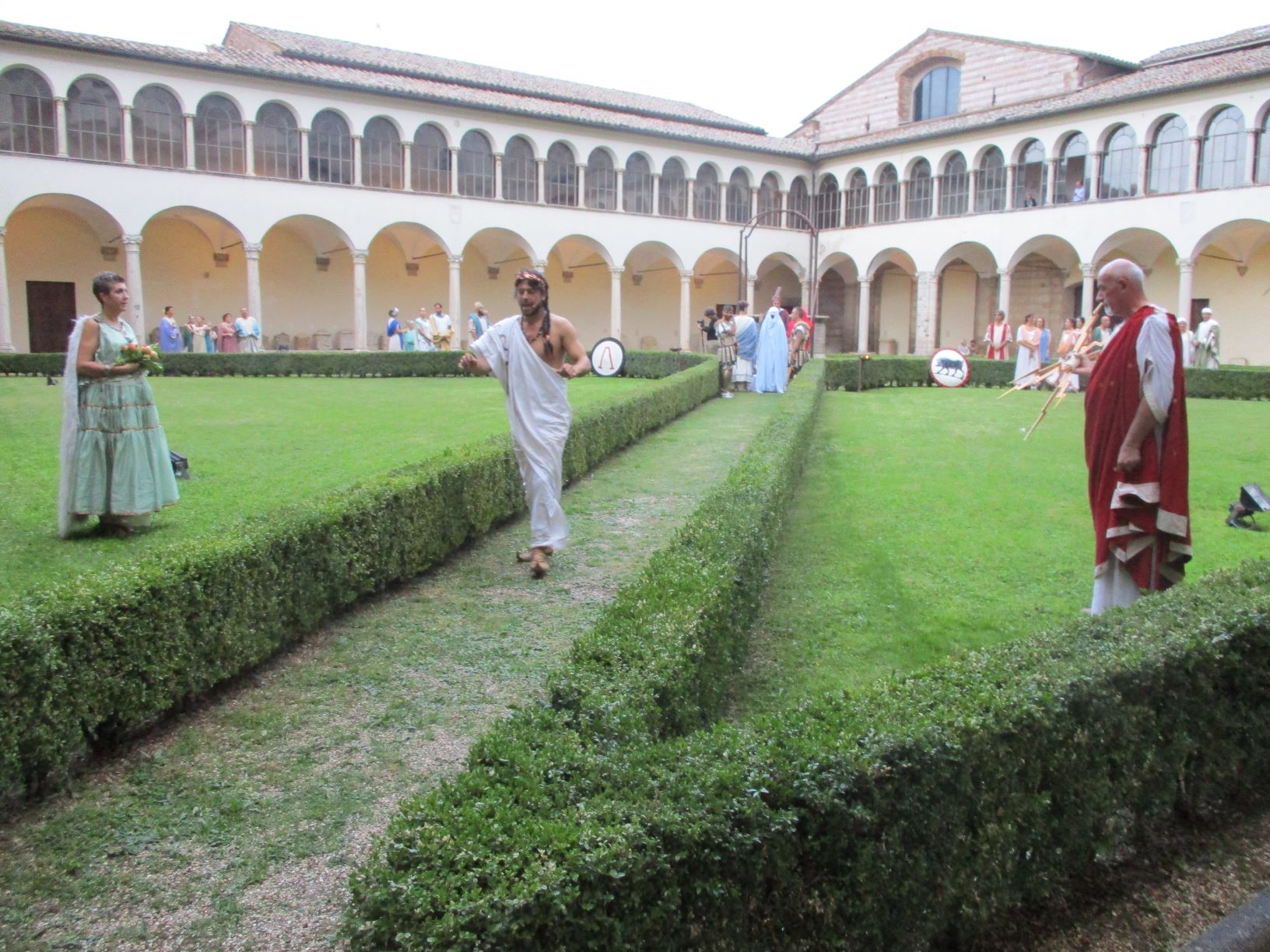 Numerosi i riti che hanno preceduto il momento conclusivo della cerimonia: il dono agli sposi, da parte dello Zilath e della Sacerdotessa, consistente nel “lebes gamikos”, vaso simbolico del patto nuziale da cui gli sposi compiono il rito della consumazione bevendo il vino dopo essersi divisi una focaccia. E poi i festeggiamenti sono proseguiti con il lancio del farro ( al posto del riso degli attuali matrimoni). Musiche e danze degli invitati hanno coinvolto il numeroso pubblico presente dislocato sotto i portici del chiostro.