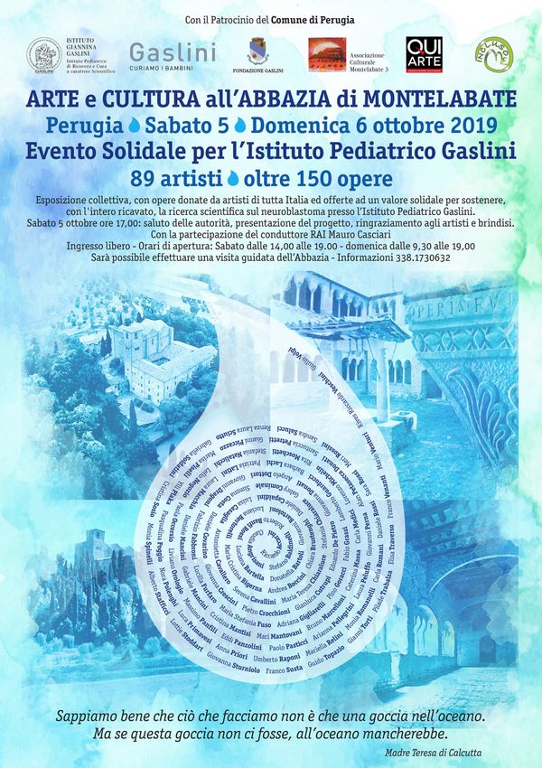 “Arte e cultura all’abbazia di Montelabate”, da sabato 5 a domenica 6 ottobre, porterà in un luogo simbolo del capoluogo oltre 150 opere di 89 artisti, con lo spirito migliore di cui è capace l’arte: promettendo molto al prossimo senza chiedere nulla per sé. L’intero ricavato delle opere vendute durante la due giorni sarà infatti devoluto per finanziare la ricerca scientifica.