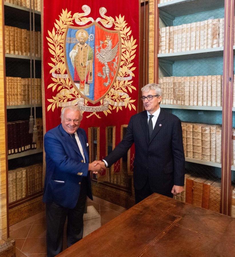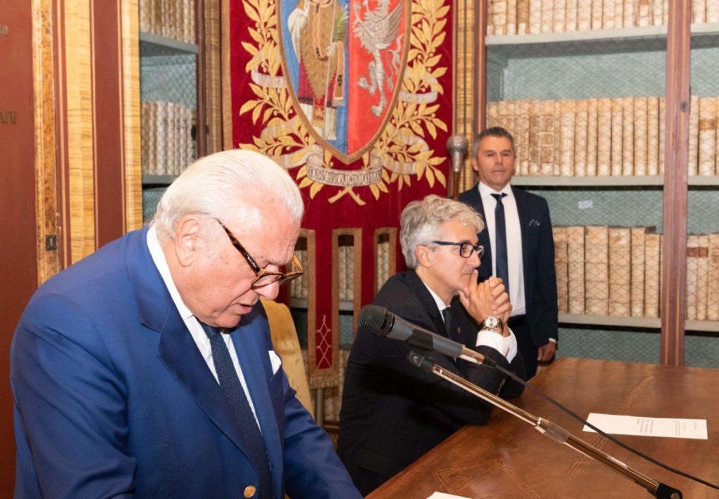 Dopo la stretta di mano con cui Moriconi ha accolto Oliviero al suo arrivo a Palazzo Murena, entrambi hanno percorso il lungo corridoio del Rettorato accompagnati dal Gaudeamus igitur, l’inno internazionale studentesco, eseguito dal Coro dell’Università degli Studi di Perugia, fino a raggiungere la Sala del Dottorato, dove era stato collocato per l’occasione il gonfalone dello Studium Generale Civitatis Perusii.