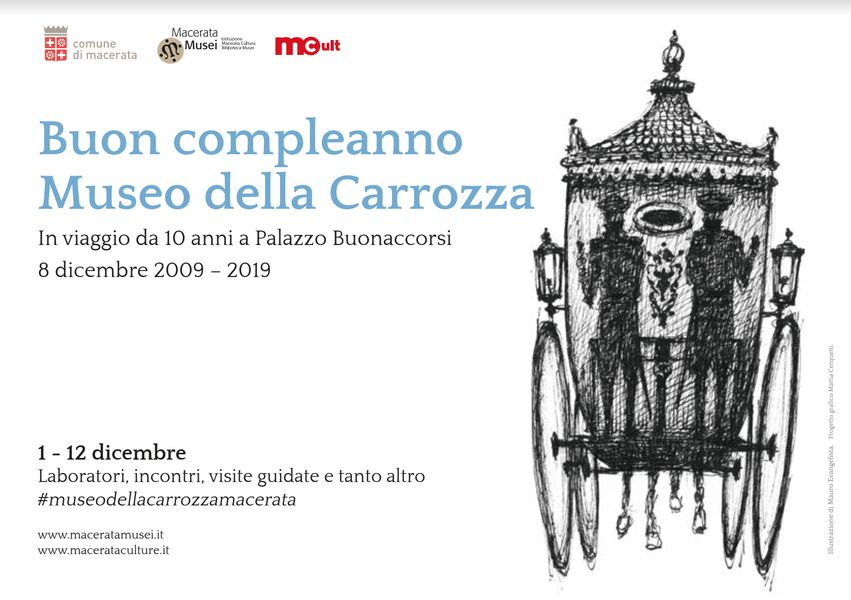 Macerata d’inverno (programma completo su www.comune.macerata.it) è ancora una volta una città da vivere e da visitare senza fretta. In un itinerario ideale, capace di coniugare le tante bellezze della città con il ricco programma del Natale, non può mancare la visita a Palazzo Ricci, con la sua collezione di arte moderna, e ai Musei civici, in particolare a Palazzo Buonaccorsi, dove, oltre alla splendida Galleria dell’Eneide, si può visitare il Museo della Carrozza, che festeggia quest’anno il decimo anniversario del riallestimento della storica collezione di carrozze. Nell’occasione, tante iniziative, soprattutto dedicate ai bambini, con visite animate e laboratori, sono state organizzate dal Comune e dall’Istituzione Macerata Cultura Biblioteca Musei, per dire tutti insieme Buon compleanno Museo della Carrozza!