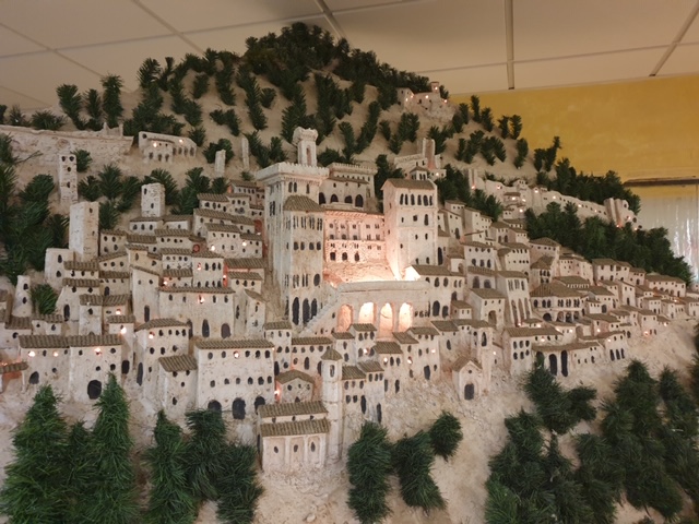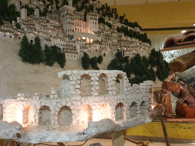 «Per realizzare il primo presepe – ricorda – impiegarono una notte, ora occorrono intere settimane con una squadra di sei persone che si alterna nell’attività di lavorare i vari materiali per realizzazione dell’opera.La particolarità consiste nel fatto che alle spalle della capanna e delle strade dove ci sono le statuine dei Re Magi, di San Giuseppe e la Madonna, si staglia una città umbra in miniatura. Dopo Spoleto, Trevi, Spello, Sellano e Castelluccio, in questa edizione è stata proposta la città di Gubbio».