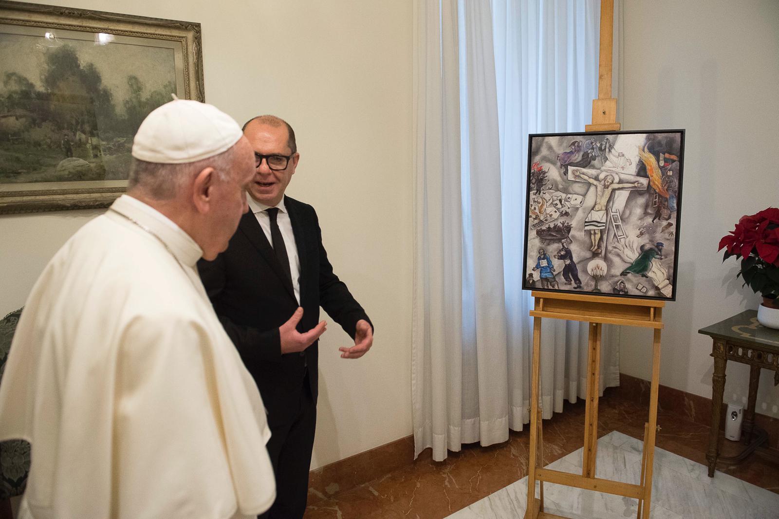 Il dipinto originale è stato realizzato nel 1938 quando Hitler e le sue truppe iniziavano la persecuzione sugli ebrei. Chagall, ha voluto racchiudere su una tela la sofferenza, attraverso l’uso di simboli e immagini. Il dipinto presenta al centro, in grande, la figura di Cristo crocifisso, preso come simbolo dell’ebraismo e, attorno a lui, scene di distruzione e persecuzione. «Il Santo Padre ha visto questo dipinto a Firenze in una mostra all’opera del Duomo e si è talmente innamorato della rappresentazione del dipinto e lo ha richiesto per poterlo avere all’interno della sua residenza. Noi quindi, fra incredulità e gioia immensa per essere stati scelti a realizzare una copia dell’opera originale ci siamo messi subito al lavoro e dopo oltre sei mesi lo abbiamo terminato ed oggi ho avuto l’onore di poterlo consegnare direttamente al Santo Padre», ha detto, Stefano Lazzari, che tiene a precisare assieme alla sorella Francesca e a tutti i giovani collaboratori della “bottega”, che «l’ispirazione è stata facilitata dal luogo dove ogni giorno lavoriamo, Città di Castello, dove Piero della Francesca, Signorelli, Raffaello e Alberto Burri hanno lasciato segni indelebili».