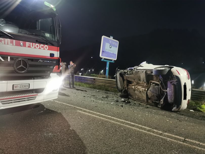 CORCIANO (Perugia) – Spettacolare incidente stradale nella notte, a Ellera di Corciano, nei pressi di Decathlon. Spettacolare e potenzialmente drammatico, a giudicare da come è finita una delle due auto coinvolte: completamente ribaltata, su un fianco, e schiacciata contro il guard rail.
