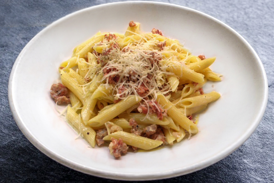 400 gr. di penne | 4 salsicce fresche | 200 ml di panna liquida | ½ bicchiere di vino bianco | parmigiano reggiano grattugiato q.b. | 2 cucchiai di olio e.v.o | sale q.b. | pepe q.b.