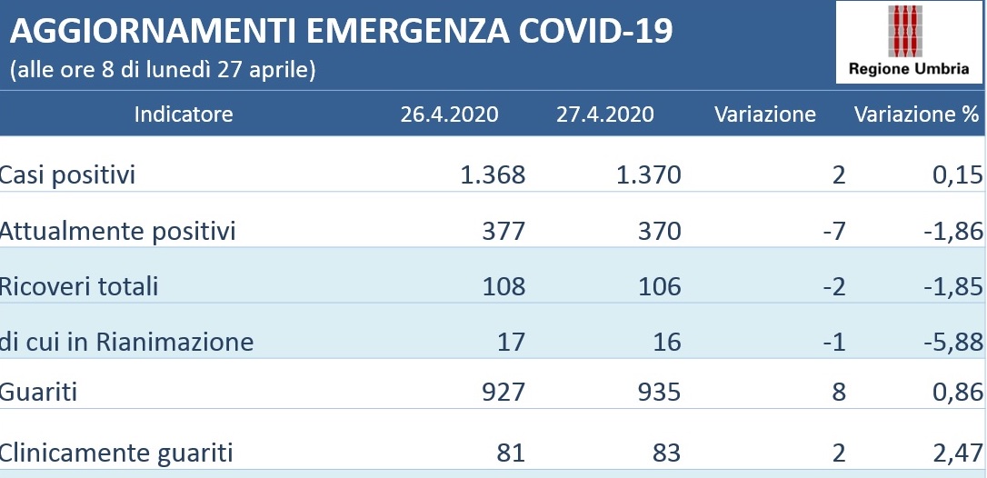 Questi i dati al momento disponibili e aggiornati alle 8 di lunedì 27 aprile: complessivamente 1.370 persone (+ 2 rispetto a ieri) in Umbria sono risultate positive al virus Covid-19, gli attualmente positivi sono 371 (- 6).I guariti sono 935 (+8); risultano 83 clinicamente guariti (+2); i deceduti sono 65 (+1). Dei 1.370 pazienti positivi attualmente sono ricoverati in 106 (-2); di questi 16 (-1) sono in terapia intensiva. Le persone in isolamento domiciliare sono 977 (-31); sempre alla stessa data, risultano 14.100 (+36) persone uscite dall’isolamento. Nel complesso, entro le 8 del 27 aprile, sono stati effettuati 32.806 tamponi (+237).