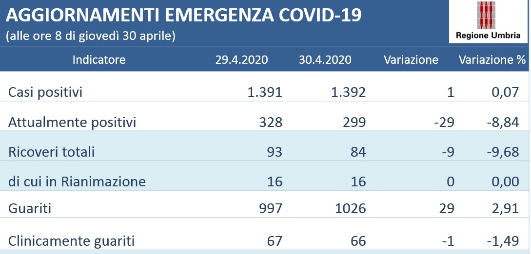 Questi i dati al momento disponibili e aggiornati alle 8 di giovedì 30 aprile: complessivamente 1.392 persone (+1 rispetto a ieri) in Umbria sono risultate positive al virus Covid-19, gli attualmente positivi sono 299 (-29). I guariti sono 1026(+29); risultano 66 clinicamente guariti (-1); i deceduti sono 67 (+1) Dei 1.392 pazienti positivi attualmente sono ricoverati in 84 (-9); di questi 16 (invariato) sono in terapia intensiva. Le persone in isolamento domiciliare sono 945 (invariato); sempre alla stessa data, risultano 15.389 (+487) persone uscite dall’isolamento. Nel complesso, entro le 8 del 30 aprile, sono stati effettuati 36.459 tamponi (+1522).