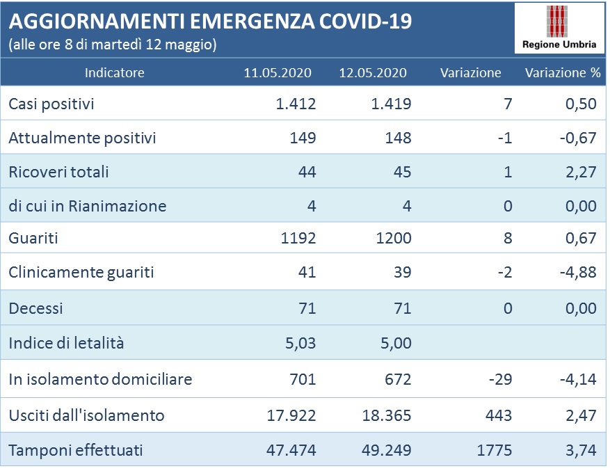PERUGIA – Questi i dati al momento disponibili e aggiornati alle 8 di martedì 12 maggio: complessivamente 1.419 persone (+ 7 rispetto a ieri) in Umbria sono risultate positive al virus Covid-19, gli attualmente positivi sono 148(-1). I guariti sono 1200 (+8); risultano 39 clinicamente guariti (-2); i deceduti sono 71 (invariato). Dei pazienti positivi attualmente sono ricoverati in 45 (+1); di questi 4 (invariato) sono in terapia intensiva. Le persone in isolamento domiciliare sono 672 (- 29), sempre alla stessa data risultano 18.365 (+443) persone uscite dall’isolamento. Nel complesso, entro le 8 del 12 maggio, sono stati effettuati 49.249 tamponi (+1775).