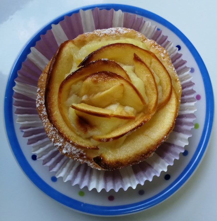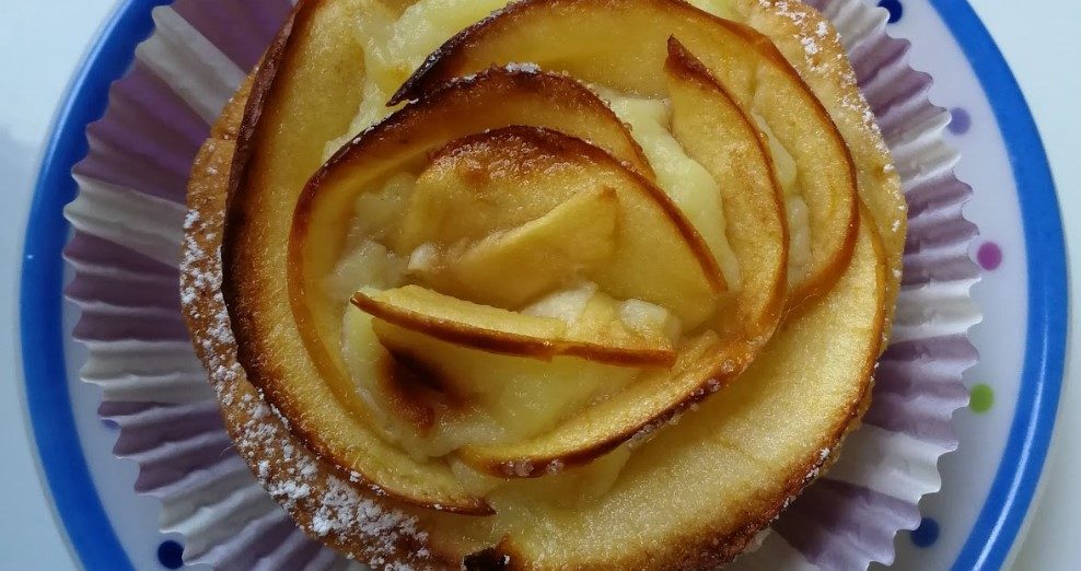- Inserire nell’incavo un cucchiaio di crema e sistemare le fettine di mela in cerchio, alternando ogni pezzetto come per formare dei petali di rosa. Infornare e cuocere per 20 minuti