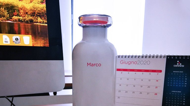 Le borracce in acciaio, molto leggere, della capacità di mezzo litro e personalizzate con i nomi dei dipendenti, sono infatti state fornite dalla Fratelli Guzzini, storica azienda recanatese produttrice di accessori per la casa e già cliente di Connesi per i servizi di connettività. Una partnership che è andata oltre gli affari commerciali e che ha visto le due aziende collaborare insieme per una buona causa.