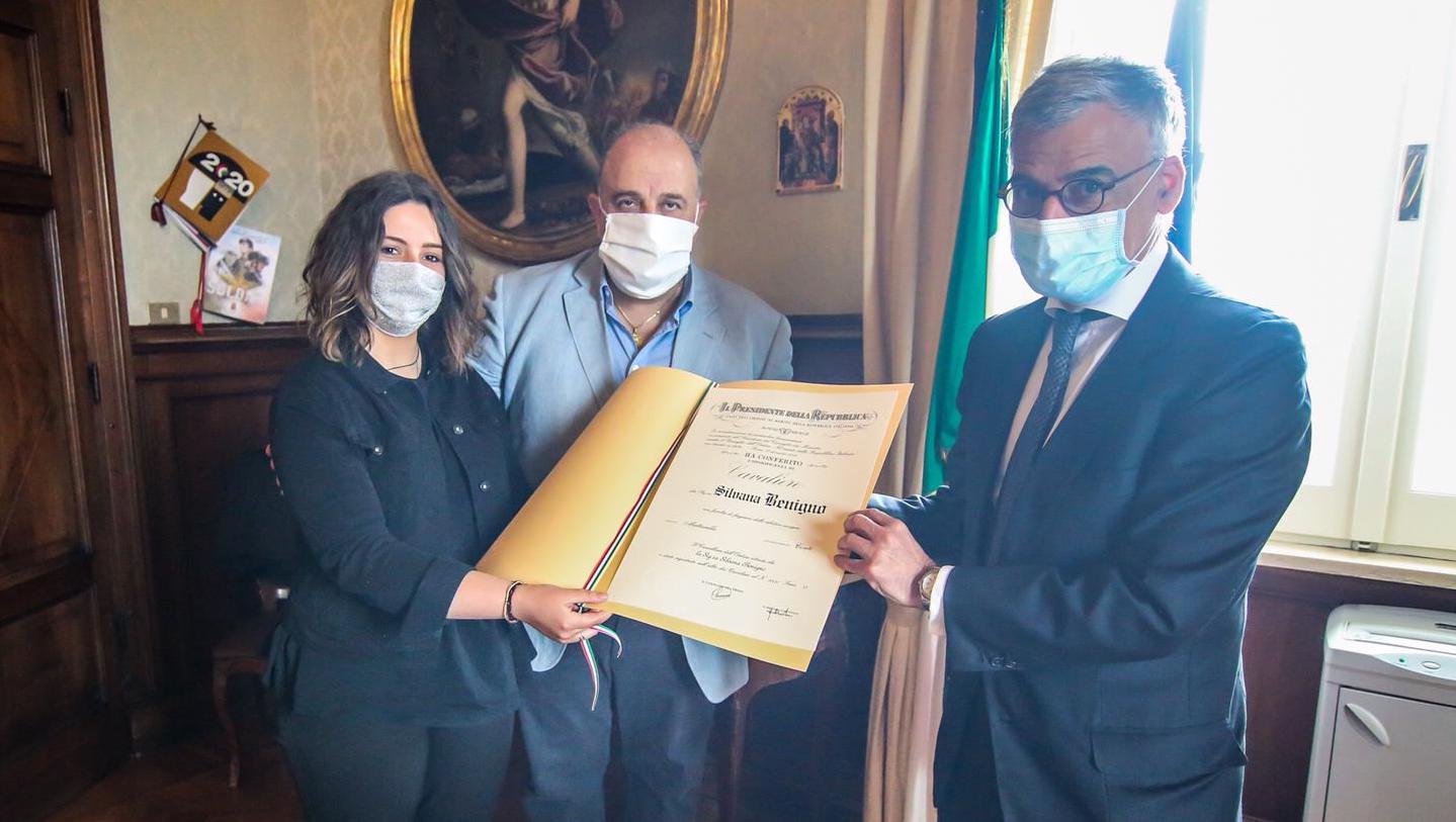 Il 5 giugno, infatti, la figlia Federica e il marito Fabrizio sono stati ricevuti dal prefetto di Perugia, Claudio Sgaraglia, che ha consegnato loro la pergamena attestante il conferimento dell’onorificenza al merito della Repubblica Italiana con la firma del Presidente della Repubblica Mattarella e quella del Consiglio Conte. L’occasione è servita a Federica e Fabrizio per donare ufficialmente al dottor Sgaraglia il libro ‘Il tuo sorriso ribelle’ da poco presentato, dove si racconta la storia di Silvana e il suo percorso durante la malattia, insieme allo straordinario messaggio di speranza e di solidarietà che ha lasciato. Tutte motivazioni che, evidentemente, hanno portato alla nomina, risalente a fine dicembre dello scorso anno, quando Silvana era ancora in vita. Federica e Fabrizio hanno ringraziato il prefetto di Perugia per aver seguito con attenzione e grande sensibilità il percorso della mamma e della moglie, ricordando bene che lo stesso dottor Sgaraglia, poche ore prima della morte di Silvana, era giunto fino a Selci per consegnare di persona a ‘mamma coraggio’ la lettera di nomina da lui stesso inoltrata. «Sono io che ringrazio voi per avermi fatto incontrare una grande donna – ha detto il prefetto – mi dispiace solo non averlo potuto fare molto prima. Quello che ha fatto nella sua purtroppo breve vita è stato veramente da ricordare ed è per questo che la pratica del conferimento ha avuto il suo iter che meritava. Non vedo l’ora di leggere il libro a lei dedicato e scoprire veramente tutto quello che Silvana ha fatto anche per gli altri». Peraltro lo stesso dottor Sgaraglia prima della consegna ufficiale ha voluto sapere tutto sul libro, sulla sua presentazione dei giorni scorsi. Federica e Fabrizio, particolarmente emozionati nell’occasione, vogliono pure rendere merito all’onorevole Walter Verini che, al pari del prefetto, ha seguito fin da subito la procedura per l’assegnazione dell’onorificenza a Silvana Benigno. Un momento, questo, descritto con dovizia di particolari dal marito Fabrizio nella parte conclusiva del libro. La pergamena dell’onorificenza, che nelle prossime ore avrà una cornice che merita, quella della Bottega Tifernate, sarà esposta per la prima volta nel corso dell’appuntamento in programma domenica 7 giugno, dalle 16 in località Brecceto di Selci, in occasione del compleanno di Silvana, dove il marito Fabrizio e la figlia Federica nello splendido spazio verde messo a disposizione da loro amici, presenteranno a tutti il libro e, con grandissimo orgoglio, mostreranno l’onorificenza a cavaliere al merito della Repubblica assegnata a Silvana.