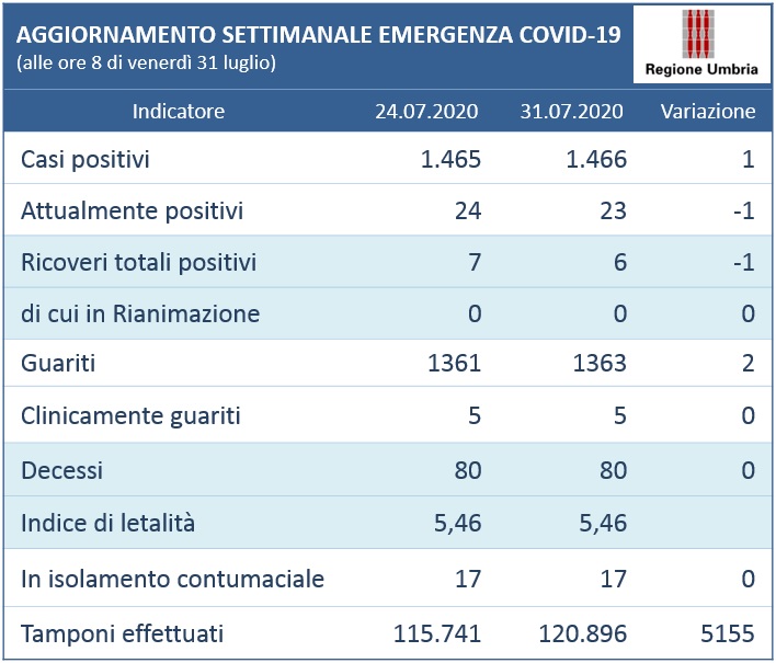 UMBRIA – Coronavirus: questi, i dati riferiti alla settimana dal 24 al 31 luglio per ciò che riguarda l’andamento epidemiologico del virus COVID-19 in Umbria, aggiornati alle ore 8 di venerdì 31 luglio: i casi positivi sono passati da 1.465 del 24 luglio a 1.466 del 31 luglio(+ 1); gli attualmente positivi da 24 sono diventati 23 (-1).