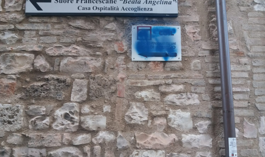 FOLIGNO (Perugia) – Questa notte ignoti vandali o seguaci della crescente intolleranza che attraversa il Paese, hanno imbrattato (come si vede dalle foto) le scritte relative alla sede della Lega SPI CGIL sita in via dei Monasteri nel centro storico di Foligno.