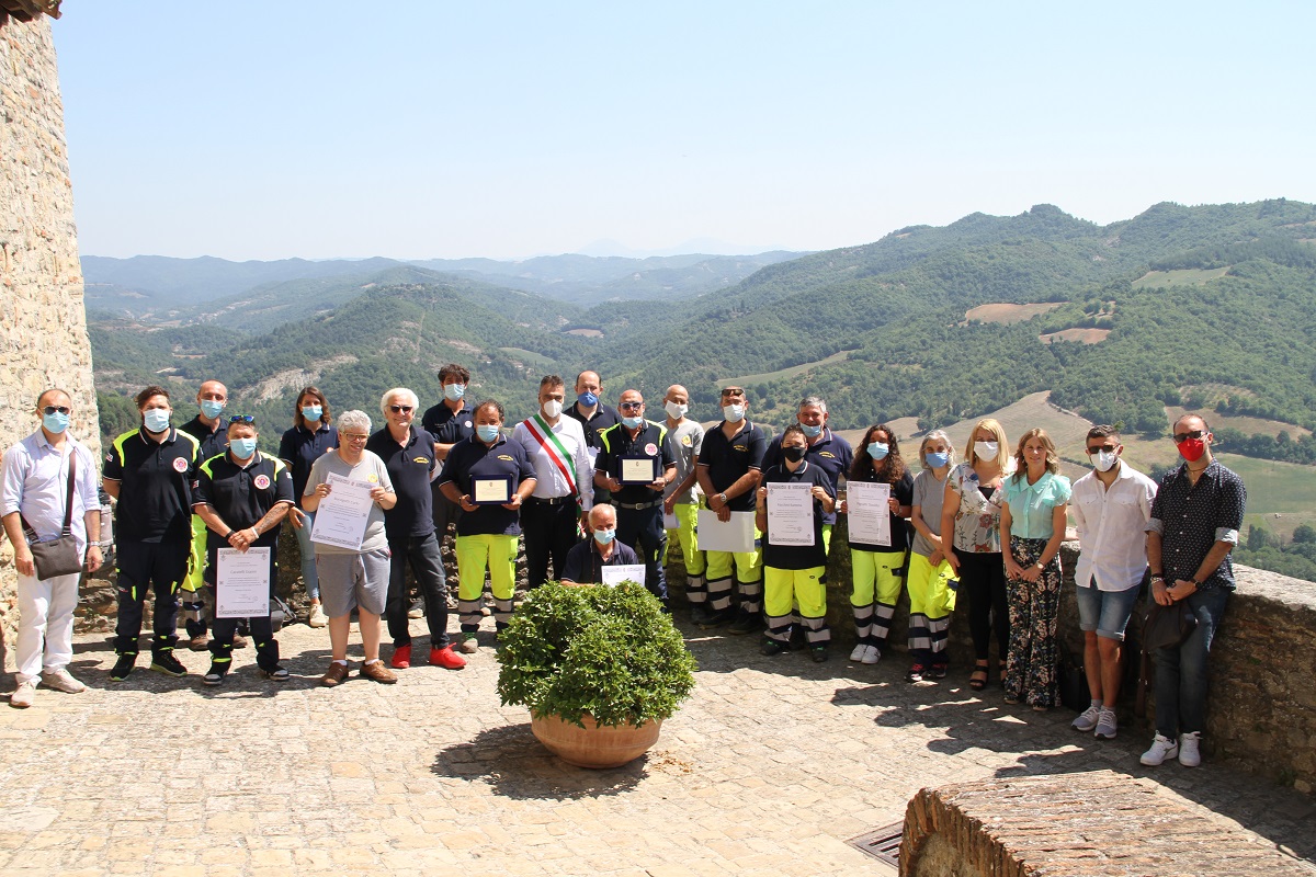 In segno di riconoscimento per il prezioso impegno speso al servizio del territorio e dei concittadini, il sindaco Mirco Rinaldi ha consegnato due targhe ai presidenti delle due Associazioni ed una pergamena a tutti i volontari che hanno prestato servizio nel corso del difficile periodo.