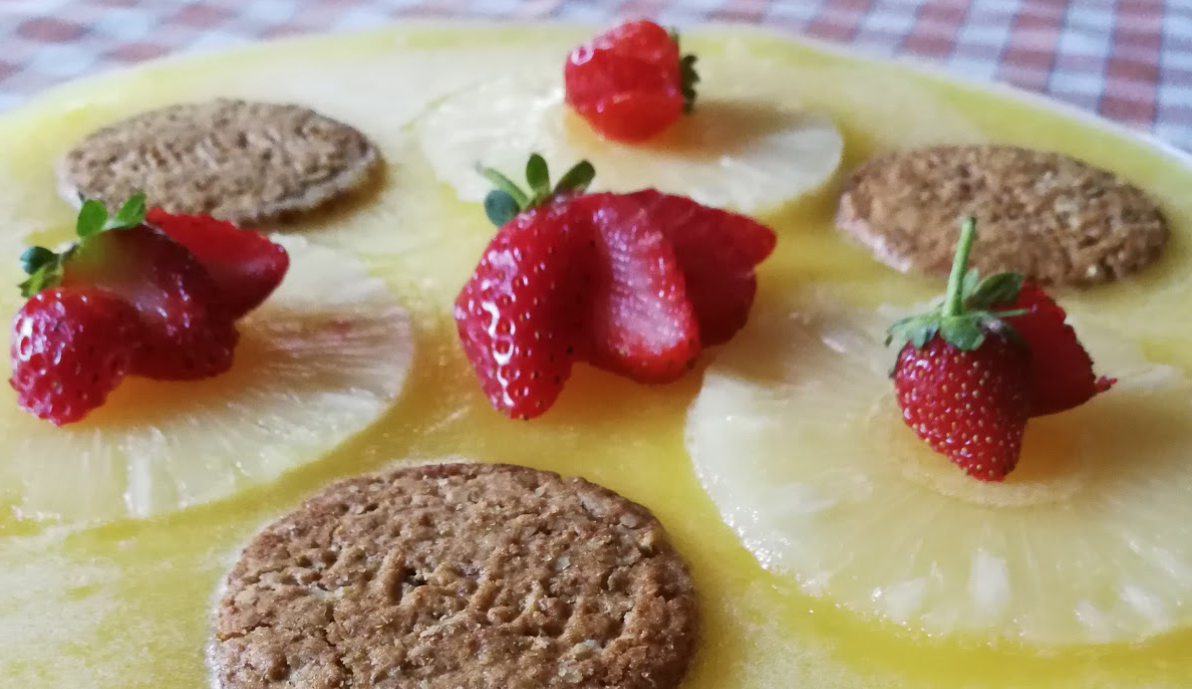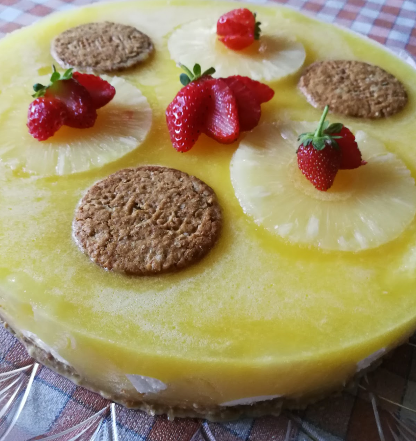 Per la base: Pan di spagna. Per la farcitura: 500 ml di panna liquida vegetale | 2 fogli di gelatina o colla di pesce | 100 gr. di zucchero a velo | 1 barattolo di ananas a fette. Per la copertura: 2 fette di ananas + succo | 100 gr. di zucchero a velo | 2 fogli di gelatina o colla di pesce