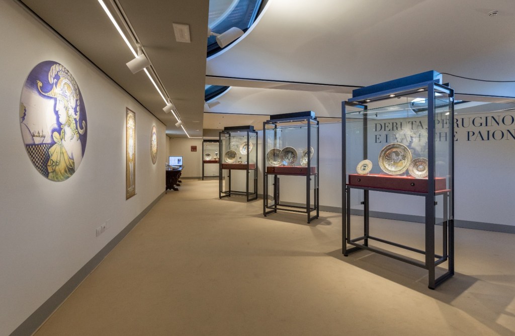 Il progetto espositivo si articola in quattro sezioni: “Deruta, Perugino, Pinturicchio e i vasi che paion dorati”, che documenta la produzione derutese dalla seconda metà del Quattrocento e il rapporto con la pittura umbra coeva; “Mastro Giorgio finì de maiolica”, incentrata sull’attivitàdi Mastro Giorgio Andreoli, divenuto celebre per l’applicazione dei lustri in oro e rubino sulle maioliche, e della sua bottega fra Quattro e Cinquecento; “Raffaello e l’istoriato”, che attraverso una selezione di alcune opere appartenenti alla Collezione di Maioliche Rinascimentali della Fondazione Cassa di Risparmio di Perugia documenta l’influenza di Raffaello sul cambiamento della ceramica e dell’affermarsi dello stile istoriato nella prima metà del Cinquecento.
