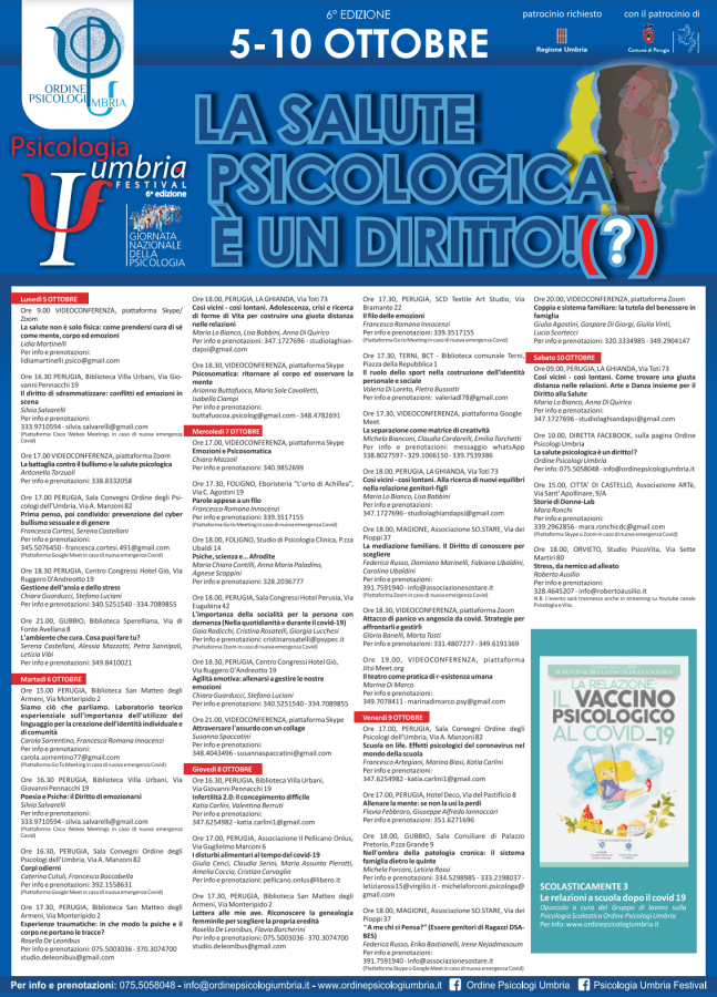 PERUGIA – Una serie di incontri di grande interesse per la popolazione, alle prese con i gravi disagi legati alla pandemia in atto, sviluppati sul tema generale “La salute psicologica è un diritto!(?)”. Torna, per la sua sesta edizione, lo Psicologia Umbria Festival. L’appuntamento sarà presentato venerdì 2 ottobre alla sala Fiume di palazzo Donini alle ore 11,45.