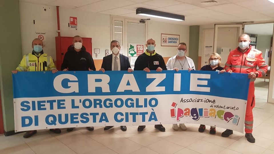 TERNI – «Grazie, siete l’orgoglio di questa città». Con queste parole, riportate in uno striscione, l’associazione I Pagliacci guidata da Alessandro Rossi, da molti anni attiva nella città di Terni con testimonianze ed iniziative concrete di solidarietà e di vicinanza ai sanitari impegnati nella lotta contro il virus, hanno voluto esprimere gratitudine e vicinanza al personale del 118 e agli operatori tutti dell’azienda Usl Umbria 2.