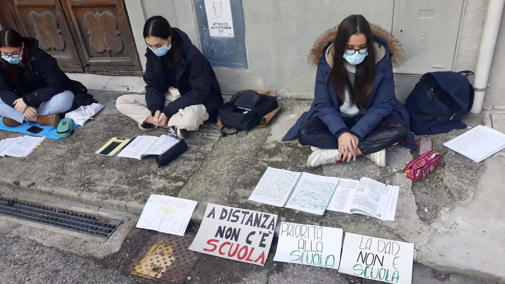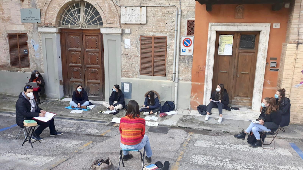 I ragazzi e l’insegnante si sono confrontati sui versi leopardiani della Ginestra, sul messaggio di solidarietà e resilienza che essi comunicano, sulla bellezza e il coraggio generati dal dolore. Un piccolo tempo, apprezzato, di vero dialogo formativo, all’aperto ma scaldato dalla presenza fisica di corpi, sguardi e parole non indeboliti dallo schermo. Un piccolo monito a non dimenticare la scuola, garanzia imprescindibile di libertà, democrazia, inclusione e cittadinanza, bene essenziale e civile che, anche nelle situazioni di emergenza, dovrebbe essere l’ultima a chiudere (se inevitabile) e la prima a riaprire, con uno sforzo di pianificazione ed investimento affinché ciò possa avvenire in sicurezza. Quest’azione nasce in seno al movimento “priorità alla scuola”, che dal primo lockdown in tutta Italia porta avanti azioni simili, per ribadire la centralità che la scuola dovrebbe avere in tutto il paese e in tutta Europa, e per chiedere con forza che l’anno scolastico possa continuare in presenza per tutti gli studenti e tutte le studentesse, di ogni ordine e grado, ma in totale sicurezza; per rendere questo reale sono necessari fondi e finanziamenti sostanziosi, da parte del governo centrale e dalle regioni. Le lezioni all’aperto e il praticare la didattica a distanza davanti alle scuole sono pratiche di resistenza di studenti e docenti che non si arrendono e non si lasciano scoraggiare da una didattica che doveva essere emergenziale ma che sta diventando la normalità, e questo è ciò che non vogliono.