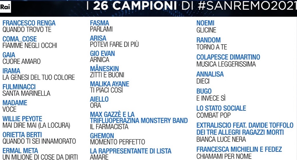 La nave bolla, i 26 big in gara e ora ecco gli assi: l’edizione 2021 del Festival di Sanremo, in programma dal 2 al 6 marzo prossimi, si annuncia particolarmente interessante e per nulla in sordina nonostante il coronavirus.