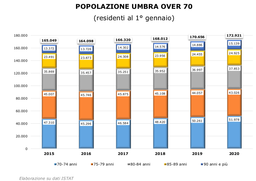 PERUGIA – «In Umbria gli over 70 sono quasi 173mila, in pratica l’intera popolazione di Perugia. La nostra è la terza regione in Italia per età media più alta (ben oltre i 47 anni) e la tendenza all’invecchiamento è in aumento, in particolare per i cosiddetti “grandi anziani”, over 80 e over 90, che sono anche le fasce d’età più presenti nelle case di riposo, con una netta prevalenza delle donne».