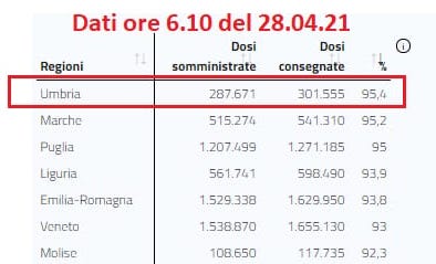 Le Marche, la Regione che è al secondo posto, è partita da un gap rilevante, mentre il Veneto viene risucchiato indietro. Come più volte detto non è questo il problema, ma la continuità e la capacità di lavorare su livelli di dosi giornaliere molto elevate. Le 18mila somministrazione al giorno restano l’obiettivo umbro di questa campagna vaccinale.