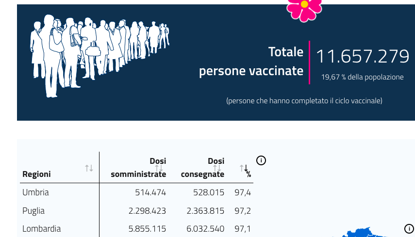 L’Italia, mantenendo questo ritmo, la raggiungerà, informa uno studio commissionato dal Sole24ore, il 6 settembre, giorno nel quale sarà vaccinato con doppia dose il 70% della popolazione.