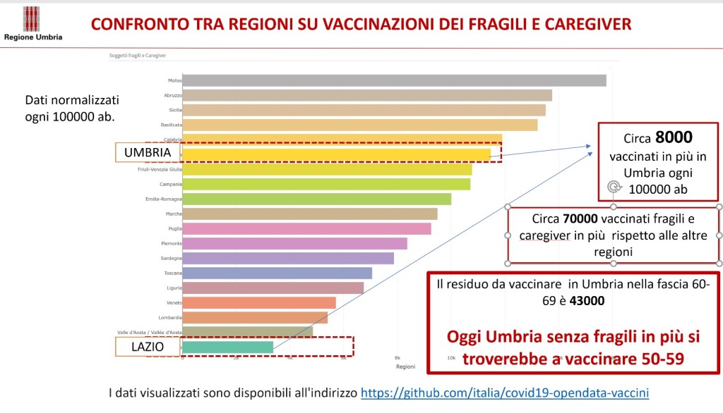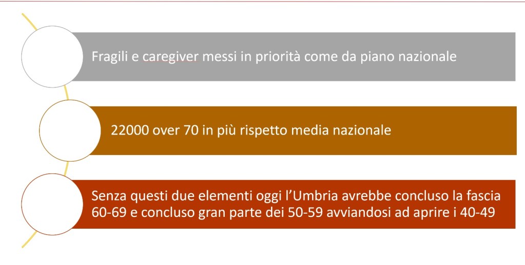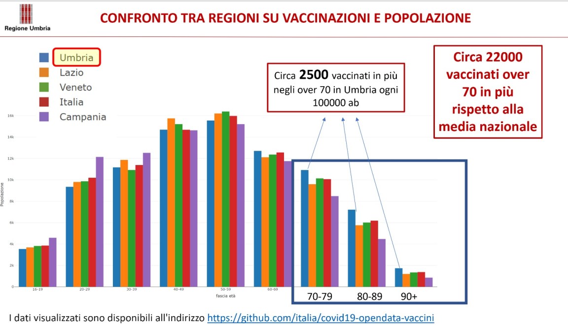 PERUGIA – Il vulnus è la categoria della presidente della Regione (come segnalato alcuni giorni fa da Cityjournal): tra i 69 e i 60 anni l’Umbria è la penultima regione in Italia per vaccinazioni (dati aggiornati: ventesima). La spiegazione c’è e l’abbiamo già prospettata a grandi linee per i nostri lettori. Ora tocca al commissario per la lotta al Covid della Regione Umbria, Massimo D’Angelo, mettere i dati in fila (come si vede anche dia grafici che pubblichiamo).