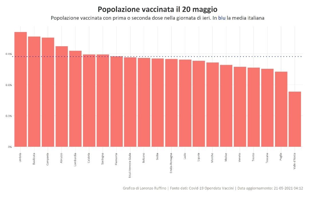 PERUGIA – Un giorno da leoni per le vaccinazioni in Umbria. Contando che sia ilVprimo di una serie. Diecimila somministrazioni sfiorate in 24 ore, la prima regione in Italia (ben oltre la media nazionale e davanti alla Basilicata – seconda – e Campania e Abruzzo), oltre l’1% della popolazione. E tenendo presente che, a livello nazionale, è stato un giovedì nel quale si sono superate largamente le 500mila somministrazioni, l’obiettivo giornaliero indicato da Figliuolo, in attesa delle performance ancora migliori attese per giugno.