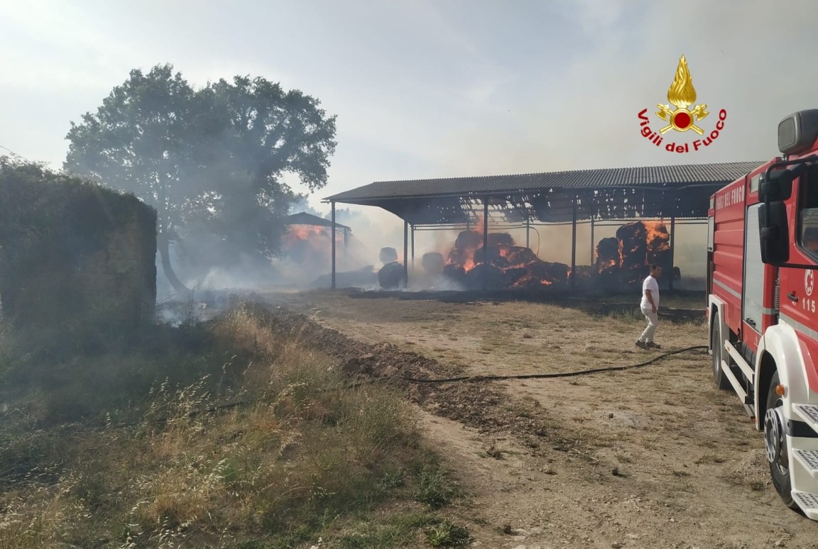 TODI – Prima le sterpaglie poi il fienile. Questo il “percorso” delle fiamme, ricostruito dai vigili del fuoco, impegnati in località Torrececcona nello spegnimento dell’incendio che ha interessato una rimessa di fieno.