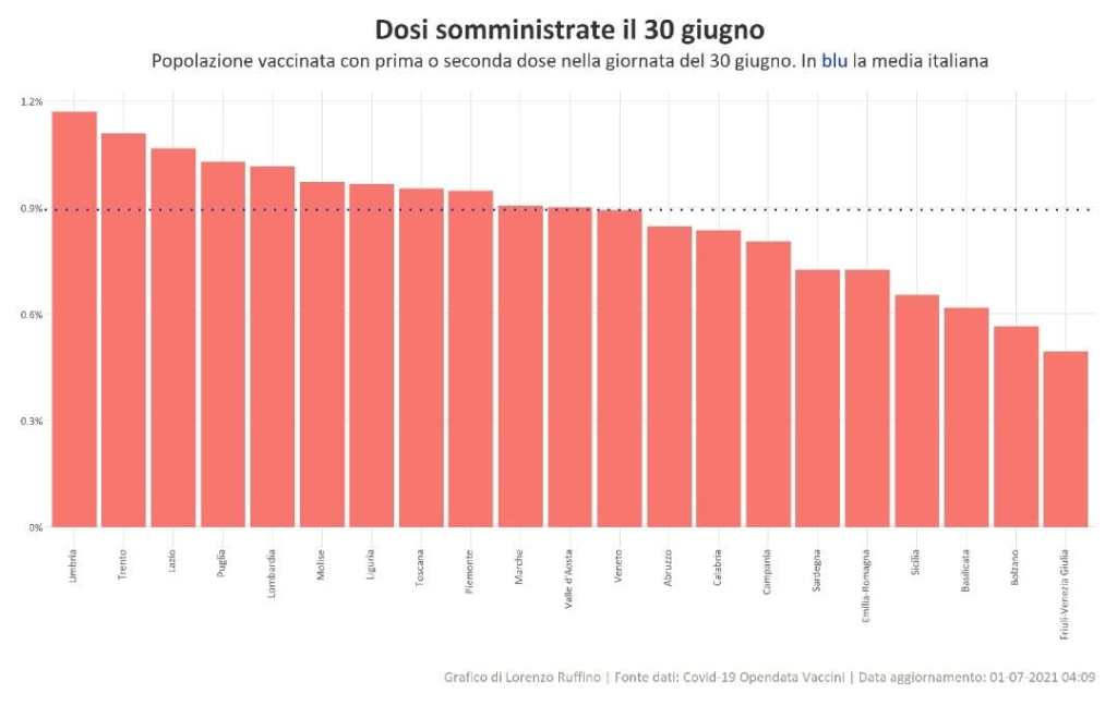 Per altro il passo tenuto dalla campagna vaccinale in Umbria è sostenuto: lo segnala la grafica che dice come nella giornata del 30 giugno l’Umbria è stata la prima regione in Italia a somministrazioni rispetto alla popolazione, e questo nonostante abbia ridotto sensibilmente l’utilizzazione della dosi, proprio per far fronte a eventuali emergenze e per non farsi trovare sprovvista (84,4% è uno dei tassi minori di utilizzo della regione dall’inizio della fase cruciale della campagna vaccinale).