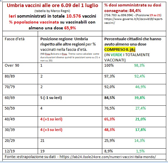 I dati non positivi – ma frutto di una precisa scelta – vanno rintracciati nella colonna che indica, nella grafica, la seconda dose. Per la categoria 79-70 solo il 46,9% ha ricevuto due dosi. Percentuale che non arriva al 40 per i 69-60. Questo potrebbe creare problemi adesso con il famoso green pass. L’Europa consente libera circolazione solo a chi ha avuto due dosi o una monodose J&J. Forse qualche viaggio dovrà essere rimandato. Con un cinico calcolo economico, se ne avvantaggia il turismo italiano, che sta segnalando dati da record (e anche l’Umbria ne sta approfittando) in questo avvio di luglio.