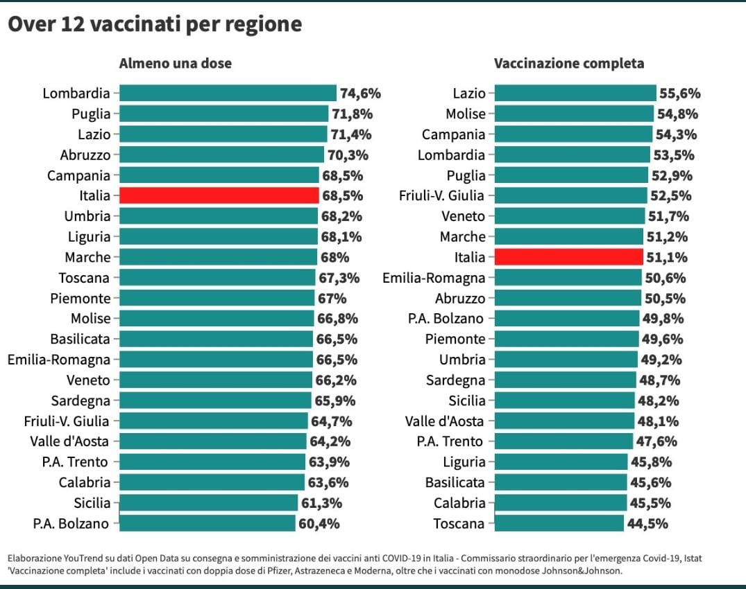 Lo stato dell’arte dice che l’Umbria è sesta tra le regioni che hanno iniettato almeno una dose, ma è solo tredicesima nel computo delle vaccinazioni complete con seconda dose. Qui si sono mossi più rapidamente i giganti Lazio e Lombardia e la Puglia che ha per assessore alla sanità un ex del Cts.