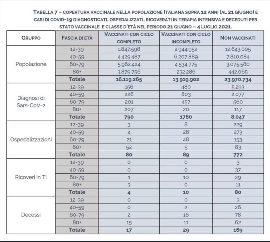 Ora ecco il salto in alto che si verifica statisticamente e nei numeri reali con i non vaccinati: i nuovi casi (il periodo in esame è tra il 21 giugno e il 4 luglio, con la variante Delta che stava già picchiando) sono 8.047, con 772 ospedalizzati e 80 terapie intensive. I decessi arrivano a 169.