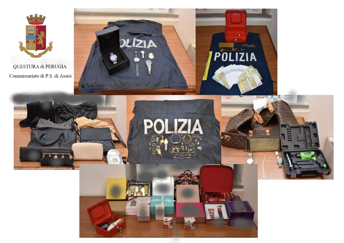 Giovedì notte è stato scovato in una delle loro basi logistiche dove si era nascosto, un uomo di 36 anni, pluripregiudicato e infine nella serata, grazie alla preziosa sinergia con i militari dell’Arma dei carabinieri di Assisi, è stato tratto in arresto anche l’ultimo dei ricercati della banda, un 56enne pluripregiudicato. Si tratta di due soggetti dal profilo criminale di elevato spessore, secondo gli investigatori, che per l’abitualità maturata nell’attività delittuosa e nell’adozione di un vero e proprio stile di vita criminoso, assurgono a figure di spicco dell’associazione criminale. Entrambi esecutori materiali dei delitti ascritti, partecipavano ai sopralluoghi dei furti e con efferatezza li portavano a compimento. Il più giovane, tra l’altro, prendeva parte al consorzio criminoso nonostante fosse in regime di restrizione della propria libertà personale, in quanto detenuto nel carcere di Spoleto in regime di semilibertà. Di giorno partecipava al programma criminoso e di notte rientrava in carcere. Lunedì mattina nel corso delle perquisizioni nelle abitazioni dei sodali della banda, gli agenti del commissariato diretto da Francesca Di Luca, rinvenivano oltre ad una perfetta riproduzione di una pistola della tipologia soft air, delle banconote false, numerosi monili in oro, un vasto assortimento di profumi ancora dentro le scatole perfettamente integri e delle borse griffate verosimilmente contraffatte.