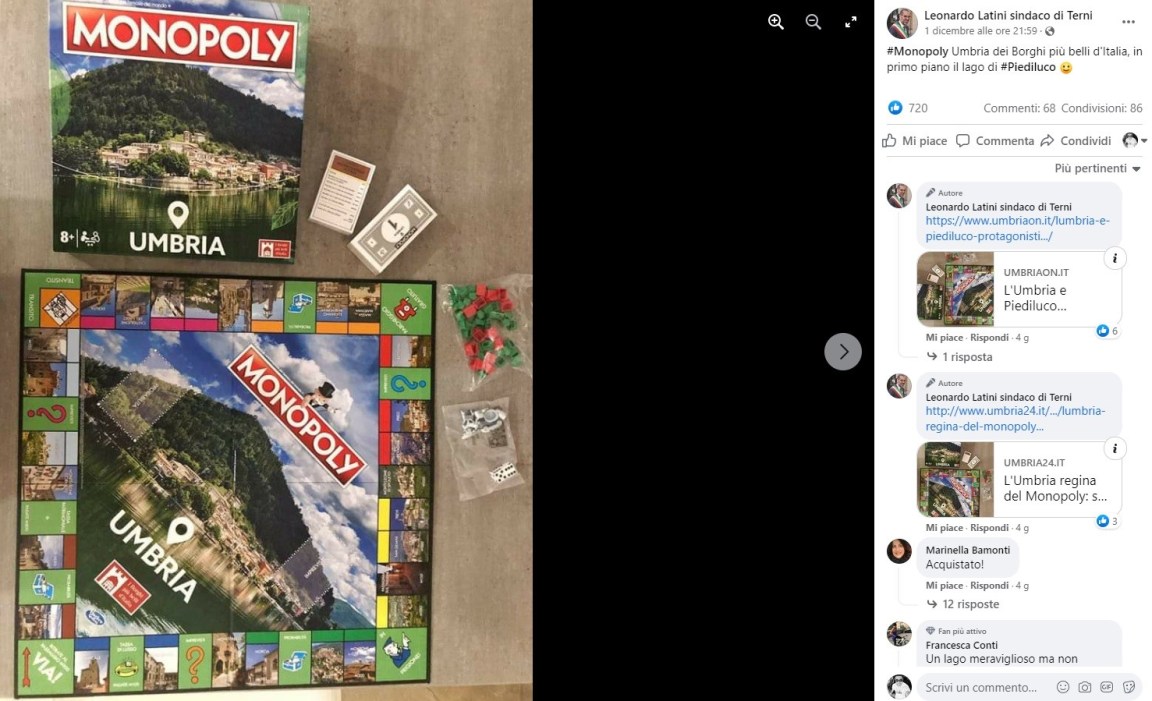«Sin dalla prima richiesta – scrive Domiziani – si è lavorato con grande sinergia tra i comuni umbri dell’associazione con l’invio del materiale fotografico, sapendo già del successo che avrebbe avuto questa idea promozionale delle piccole realtà». Tra i luoghi scelti anche il Lago di Piediluco, gioiello del ternano entrato nel club nel 2016 che potete vedere immortalo (foto in alto) sulla confezione del gioco, condivisa via social dal sindaco di Terni Luca Latini.
