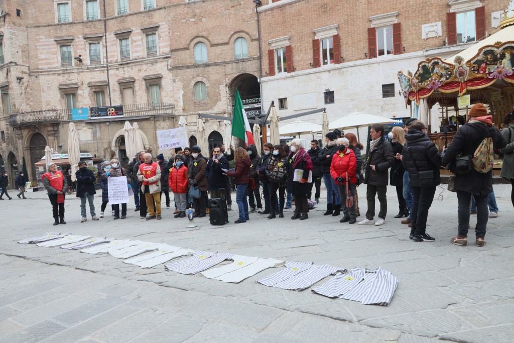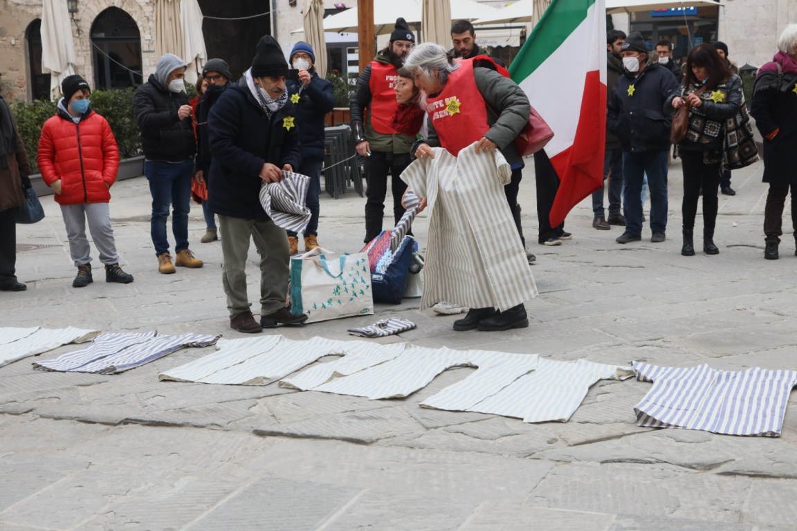 PERUGIA – Il Fronte del dissenso ha manifestato. In piazza Italia prima, poi in piazza della Repubblica, gli attivisti hanno disposto in terra casacche del tipo utilizzato dai deportati nei lager nazisti. Nella Giornata della Memoria.