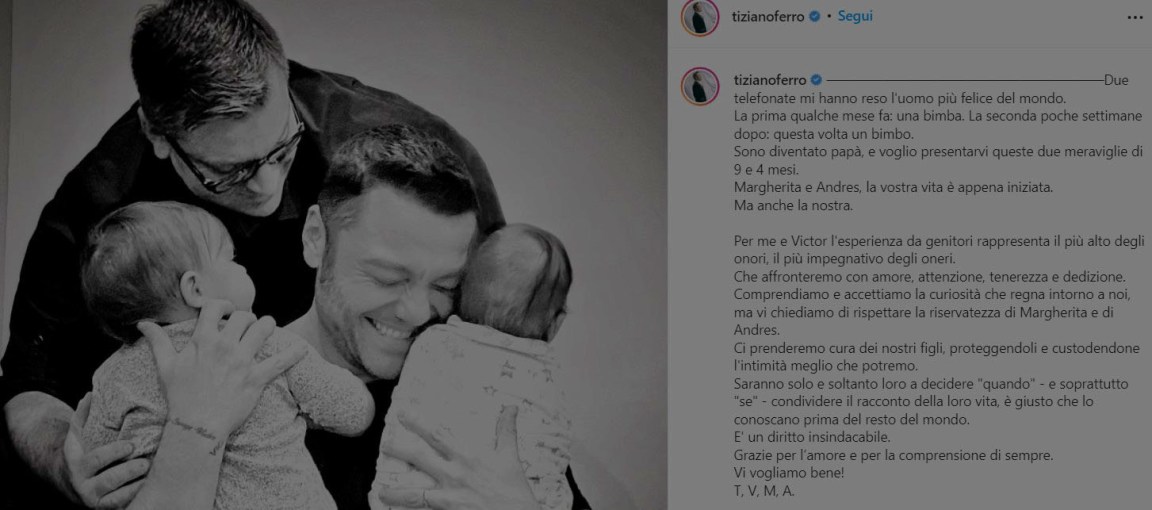 Margherita e Andres con i loro papà. Raggianti in un abbraccio di famiglia. Sono Tiziano Ferro e Victor Allen.